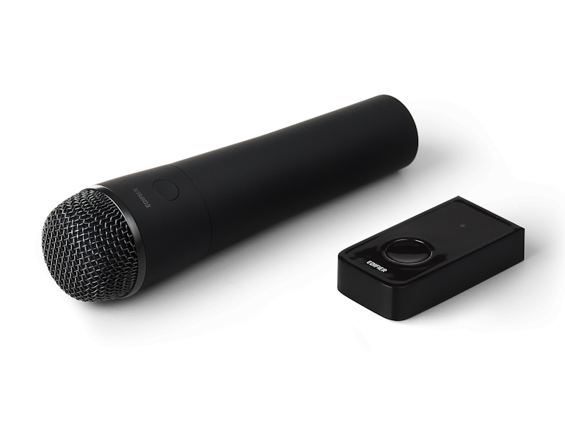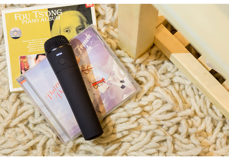 Micro nhận nhạc từ điện thoại , máy tính bảng qua Bluetooth Một thiết bị tiếp nhận sóng của bộ mic này sẽ nhận nhạc từ điện thoại, máy tính qua Bluetooth và nhận giọng hát từ mic qua sóng radio. Sau đó sẽ nhập lại và phát ra qua cổng 3,5ly. Thiết bị nhận sóng này cần được cấp điện liên tục qua cổng MicroUSB trong khi mic thì có pin bên trong sạc qua cổng MicroUSB. Chúng ta cần có loa ngoài để phát âm thanh hoặc giàn máy lớn hay âm thanh trên xe hơi cũng được. Tuỳ theo chất lượng loa nữa thì sẽ có một giàn Karaoke mimi ngon.
