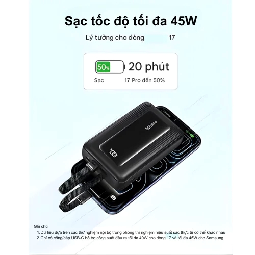USB-C (Input 20W/Output 30W), Lightning (27W), USB-A (22.5W), 2 cáp tích hợp