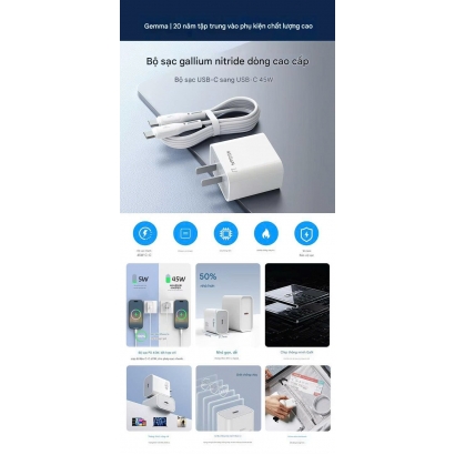 - Công suất 45W: sạc nhanh điện thoại, tablet, laptop mỏng nhẹ.