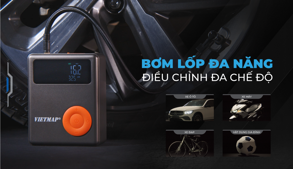 Phụ kiện ô tô Bơm Lốp Kích Bình VIETMAP 4 trong 1 - thiết bị bơm điện tử đa năng đáp ứng nhu cầu sử dụng đa dạng, dùng để bơm lốp ô tô, xe máy, xe đạp, nệm hơi, vật dụng gia đình đều rất phù hợp và đơn giản.