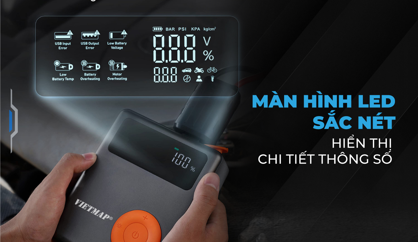 Tích hợp màn hình LED hiển thị chi tiết thông số áp suất lốp cùng % dung lượng pin giúp người dùng dễ dàng theo dõi đồng thời có kế hoạch sạc pin & sử dụng chủ động hơn.