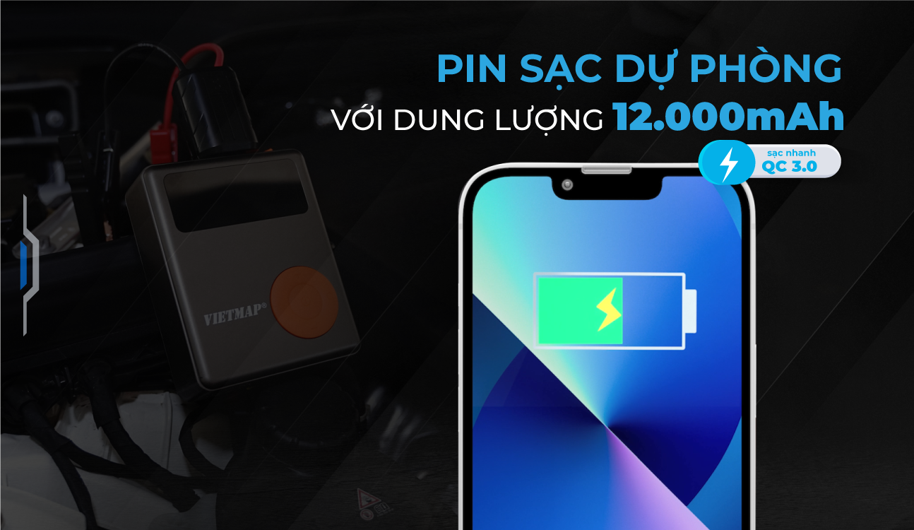 Sản phẩm Bơm Lốp Kích Bình VIETMAP 4 trong 1 với lõi là pin Lithium có tổng dung lượng 12000mAh được tích hợp mạch xử lý nguồn thông minh bảo vệ an toàn cho người sử dụng và thiết bị. Ngoài ra người dùng còn có thể sử dụng thiết bị như một pin sạc điện thoại dự phòng với công nghệ sạc nhanh QC 3.0