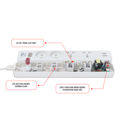 Thiết kế lõi sứ chịu nhiệt chống cháy, vỏ nhựa ABS chống vỡ, kèm hai cổng sạc nhanh USB và USB Type-C công nghệ mới nhất. Sản phẩm an toàn, bền bỉ, tiện lợi cho mọi gia đình và văn phòng.