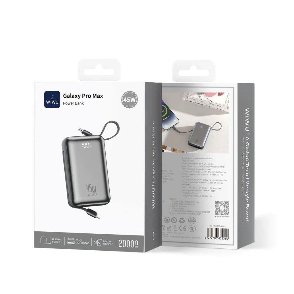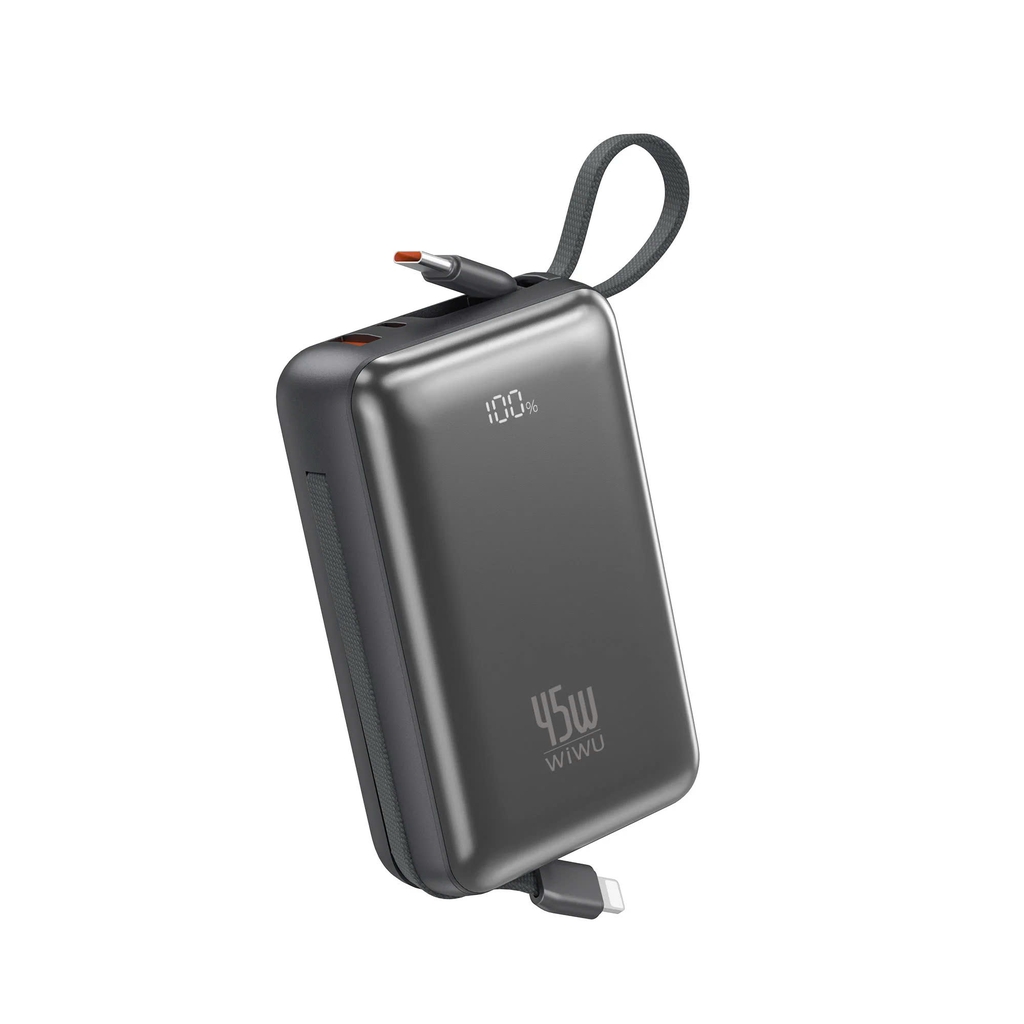 WiWU Power Bank AS-182 là phiên bản pin sạc dự phòng cao cấp với công suất sạc nhanh PD lên tới 45W, đủ mạnh để sạc laptop, iPad, điện thoại Android & iPhone. Dung lượng lớn 20.000mAh, hỗ trợ sạc nhanh hai chiều, kèm cáp Type-C và Lightning tích hợp, cực kỳ tiện lợi khi mang theo.