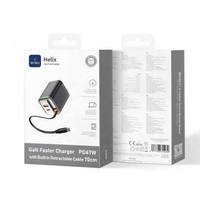 Củ sạc nhanh GaN WiWU Helix 67W tích hợp cáp rút Type-C