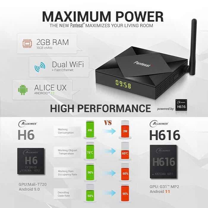 TV Box Q4K Pantesat là thiết bị giải trí chạy Android 11, cho phép biến TV thường thành Smart TV với khả năng xem YouTube, Netflix, IPTV, xem phim online, nghe nhạc, lướt web và cài đặt hàng nghìn ứng dụng từ CH Play.